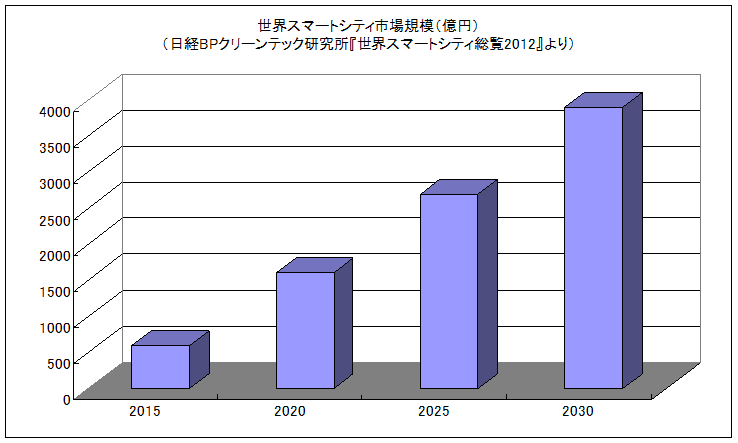 では、スマートシティの市場は今後どうなるでしょうか。2011年12月に日経BPクリーンテック研究所が発表した『世界スマートシティ総覧2012』によると、世界のスマートシティ市場は累積ベースで2015年時点で約600兆円、2030年時点で約4000兆円となっています。ここで注目なのが、この統計の対象になっているのが、太陽光や風力による発電、送電システム、ガス管理システムなどエネルギー分野に限られているということ。つまり、スマートグリッドの市場規模のみを表した数字となっているのです。スマートグリッドはスマートシティの構成要素の一つに過ぎないということを考えれば、市場規模はさらに大きく広がっていることが用意に予想できます。